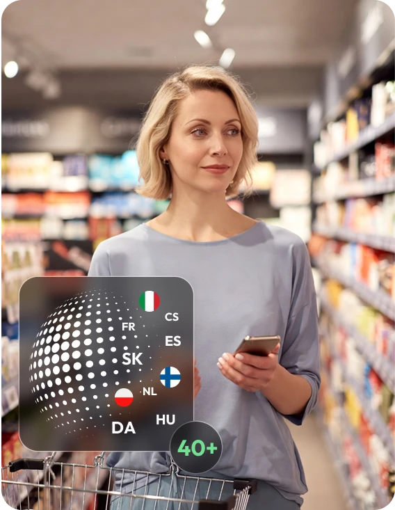 A rendszer több mint 40 nyelvet támogat, így ugyanaz a digitális címke világszerte érthetővé válik a vásárlóid számára, ezért egyetlen QR-kóddal lefedheted a teljes nemzetközi piacodat, külön nyomtatott nyelvi változatok nélkül.